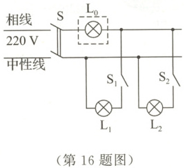16. 如图所示,断开所有开关。将相线上的保险丝取下,换上一只额定电压为 220 V 的灯泡 $ L_0$,并闭合总开关。若闭合 $ S_1$,$ L_0$不亮,说明该支路;若闭合 $ S_2$,$ L_0$正常发光,说明该支路。(均选填“正常”“断路”或“短路”)