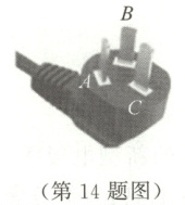 14. 如图是生活中常见的三脚插头,插脚 B 插入插座后连接的是(选填“相线”“中性线”或“保护线”),插脚 C 的长度要比 A、B 都(选填“长”或“短”)。