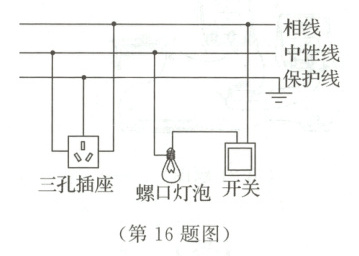 16. 如图所示,在遵守安全用电原则的前提下,请用笔画线表示导线,将三孔插座、控制螺口灯泡的开关和螺口灯泡正确接入家庭电路。