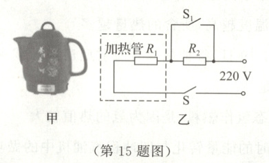 15. 如图甲是一款电中药壶,如图乙是其内部简化电路,定值电阻$R_1$、$R_2$中只有$R_1$为加热管。该壶的额定电压为220 V,加热时的额定功率为1 210 W,保温时的额定功率为40 W,则定值电阻$R_1$的阻值为Ω。若该壶工作6 min,其中加热时间为5 min,则此过程中该壶消耗的电能为J。