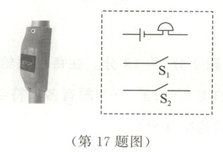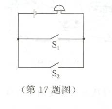 17. 如图所示,在公交车后门的两侧扶手上,各装有一个按钮开关,想要下车的乘客只要按下任意一个按钮,装在驾驶台上的电铃都会发声,提醒司机有乘客需要下车。请将虚线框内的电路图补充完整。