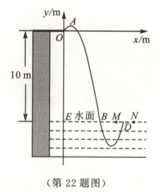 22. (12 分)2024 年 4 月 21 日晚,为期 3 天的 2024 年世界泳联跳水世界杯总决赛在西安奥体中心游泳跳水馆落下帷幕,中国跳水“梦之队”在本次赛事参加的 8 个项目中全部获得了金牌.某数学兴趣小组对跳水训练进行实践调查,某跳水运动员在 10 m 跳台上进行跳水训练,建立如图所示的平面直角坐标系,水面与$y$轴交于点$E(0,-10)$.运动员(看成一点)在空中运动的路线是经过原点$O$的抛物线,在跳某个规定动作时,运动员在空中最高处点$A$的坐标是$(\frac{3}{4},\frac{9}{16})$,且运动员在距离水面 5 m 之前,必须完成规定动作,并调整好入水姿势,否则就会出现失误.运动员入水后的运动路线是另一条抛物线.
