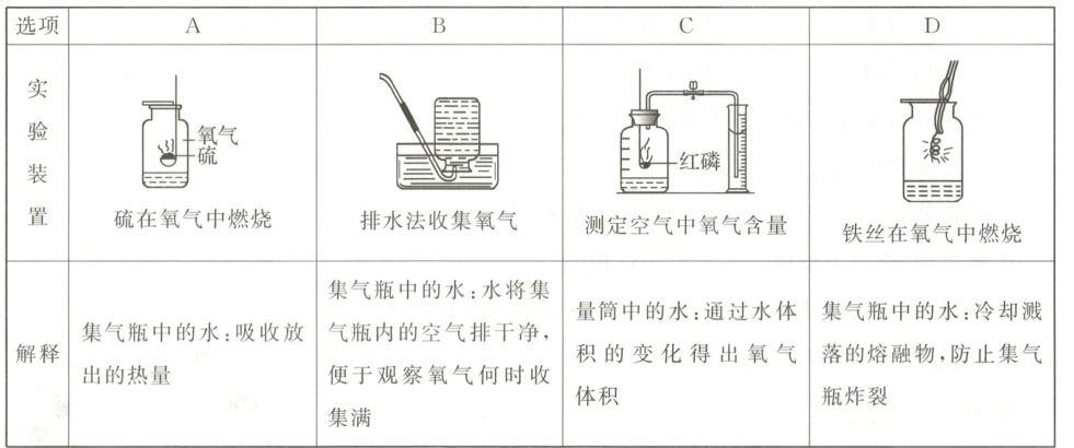 8.A 【解析】硫在氧气中燃烧,集气瓶中水的主要作用是吸收二氧化硫,防止污染空气,故 A 错误。