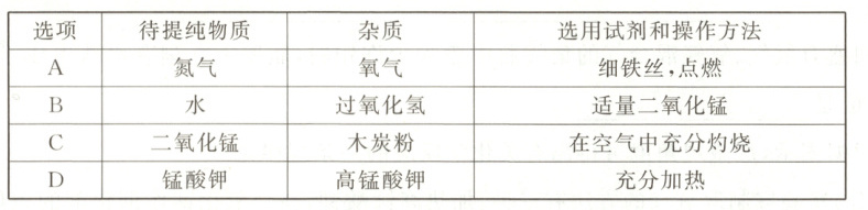 9.C 【解析】氮气不燃烧也不支持燃烧,无法在氮气和氧气的混合气体中点燃细铁丝,故 A 错误;过氧化氢在二氧化锰的催化下生成水和氧气,应再进行过滤,除去二氧化锰,故 B 错误;木炭粉在空气中灼烧生成二氧化碳气体,能除去杂质且没有引入新杂质,故 C 正确;高锰酸钾在加热条件下分解生成锰酸钾、二氧化锰和氧气,引入了新杂质二氧化锰,故 D 错误。