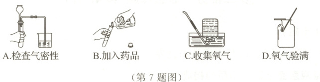7.B 【解析】长颈漏斗与大气相通,无法检查装置的气密性,故 A 错误;氧气的密度比空气大,且不易溶于水,应用向上排空气法或排水法收集,题中要求收集干燥的氧气,所以应用向上排空气法进行收集,故 C 错误;验证氧气是否集满,应将带火星的木条放在集气瓶口,木条复燃,证明已收集满,故 D 错误。