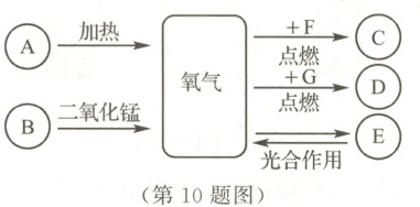 10.D 【解析】由图分析可知,物质 A 是高锰酸钾,物质 B 是过氧化氢,F 为淡黄色固体,则 F 是硫,与氧气在点燃的条件下生成二氧化硫,即物质 C 是二氧化硫,氧气与 G 反应生成 D 时火星四射,则物质 G 是铁,物质 D 是四氧化三铁,E 常温下是一种气体,且通过光合作用可以转化为氧气,则物质 E 是二氧化碳。高锰酸钾是暗紫色固体,故 A 正确;过氧化氢在二氧化锰的催化下分解为水和氧气,属于分解反应,故 B 正确;二氧化硫是无色、有刺激性气味的气体,故 C 正确;氧气转化为二氧化碳不只能通过化合反应,例如蜡烛在氧气中燃烧生成水和二氧化碳,该反应不属于化合反应,故 D 错误。