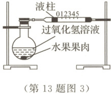 【进行实验】室温下,向图3烧瓶中加入$10\ mL$不同浓度的过氧化氢溶液与$3\ g$水果果肉,记录液柱从$0$移动至$5$的时间。