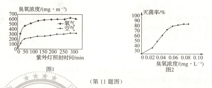 与氧气(${O_{2}}$)不同,臭氧通常状况下是淡蓝色气体,有特殊臭味。在一定条件下,氧气可以转化为臭氧。研究人员分别在充满氧气、空气的反应器中,用臭氧分析仪监测紫外灯照射产生的臭氧浓度随时间的变化,实验结果如图1。臭氧比氧气活泼得多,是一种强氧化性气体,具有较强的杀菌能力,可用于污水处理等工艺中。研究人员通过实验研究了臭氧浓度与其杀菌效果的关系,结果如图2。
