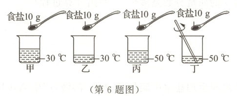 6.B 【解析】探究温度对食盐溶解速率的影响,则温度为唯一变量,要控制食盐的质量、水的体积、是否搅拌等条件相同,温度不同,故B正确。
