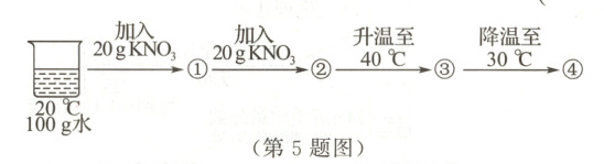 5.D 【解析】20℃时,硝酸钾的溶解度是31.6g,即20℃时,100g水中最多溶解31.6g硝酸钾,所以①是不饱和溶液,②是饱和溶液;40℃时,硝酸钾的溶解度是63.9g,即40℃时,100g水中最多溶解63.9g硝酸钾,所以③是不饱和溶液;30℃时,硝酸钾的溶解度是45.8g,即30℃时,100g水中最多溶解45.8g硝酸钾,所以④是不饱和溶液,故D正确。