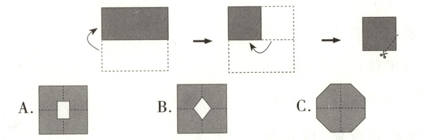 5. 新情境 陕北剪纸是珍贵的非物质文化遗产。在某次活动中,主办方通过现场操作等多种形式,让市民体验到了传统技艺的妙趣。某市民将一张正方形纸片对折两次后,剪去一个角(如图)。剪出来的图案是(