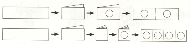 如图,把一张长方形纸对折后,在中间剪下一个圆,展开后这张纸上有2个圆;把同样一张长方形纸沿同一个方向先对折1次,再对折1次,在中间剪下一个圆,展开后这张纸上有4个圆(如图所示)。如果把同样的一张长方形纸沿同一个方向连续对折4次,在中间剪下一个圆,那么展开后这张纸上有(