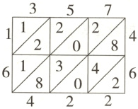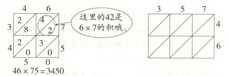 15 世纪意大利的一本算术书中介绍了一种“格子乘法”。你能仿照下面的例子算出$ 357 × 46$ 的积吗?