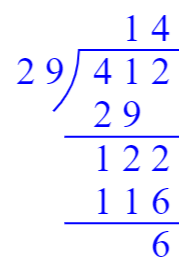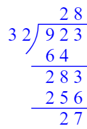 $923÷32 =$ $412÷29 =$ $192÷11 =$