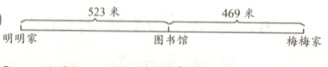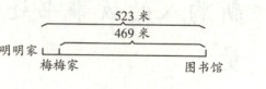 2. 明明家、梅梅家和图书馆在笔直的路上的同一侧。明明家离图书馆有523米,梅梅家离图书馆有469米。明明家和梅梅家相距多少米?(先画图,再算一算)(7分)