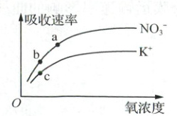 4. (2025 苏州期中)如图是胡萝卜在不同氧浓度下从硝酸钾溶液中吸收$K^+$和$NO_3^-$的曲线。影响 a、b 两点和 b、c 两点吸收速率不同的因素分别是 (