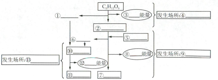 (1)①[H] ②丙酮酸 ③少量 ④细胞质基质 ⑤H₂O ⑥[H] ⑦CO₂ ⑧少量 ⑨线粒体基质 ⑩O₂ ⑪H₂O ⑫大量 ⑬线粒体内膜