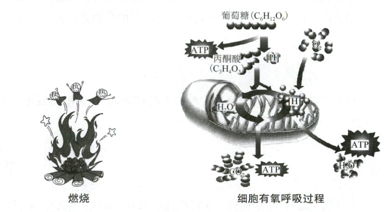 请结合下图说明有氧呼吸与有机燃料燃烧的区别。