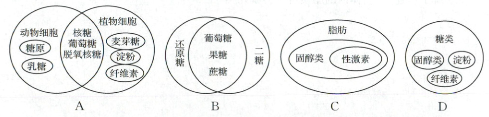 5.A 动物细胞特有的糖有糖原和乳糖,植物细胞特有的糖有麦芽糖、淀粉、纤维素、蔗糖、果糖,动植物细胞共有的糖有核糖、脱氧核糖、葡萄糖,A正确;葡萄糖、果糖是单糖,蔗糖是非还原糖,B错误;脂质包括脂肪、磷脂和固醇类,固醇类包括胆固醇、性激素和维生素D,C错误;固醇类属于脂质,不属于糖类,D错误。