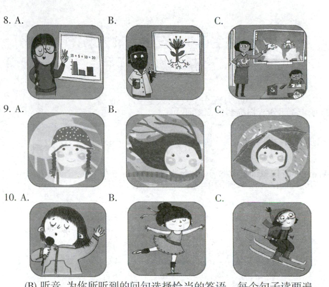 (A) 听音,选出与你所听到的句子内容相符的图片。每个句子读两遍。