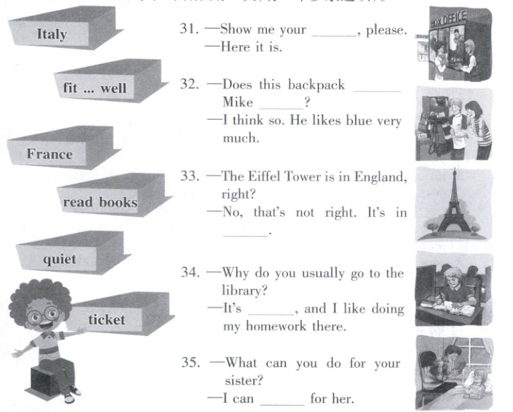 31. ticket 32. fit; well 33. France 34. quiet 35. read books