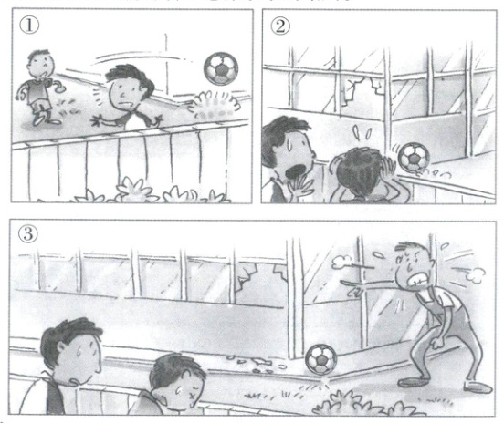 One day, Joe and Pat were playing football in the backyard. Joe kicked the football to Pat. The ball went over the fence into their neighbour’s garden. At that time they heard the sound of breaking glass. Joe ran to the fence with Pat at once. Their neighbour stood in front of his house.