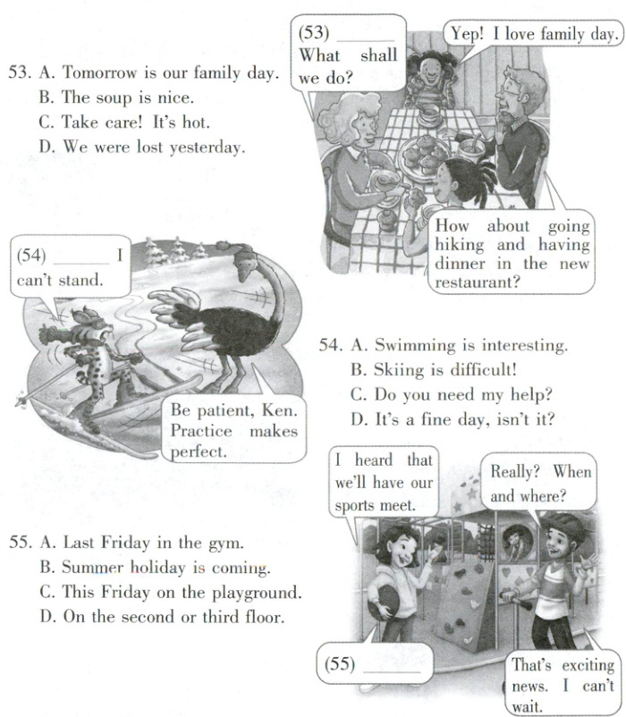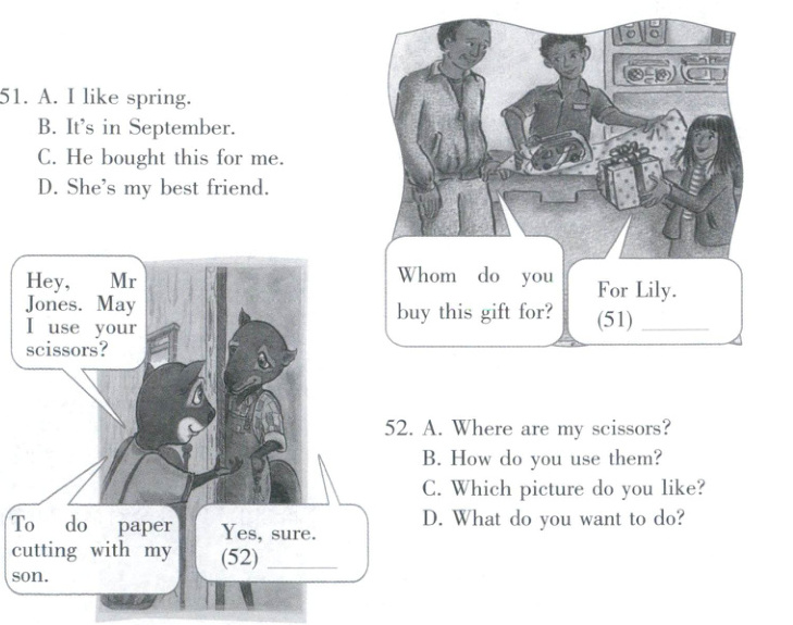 (A) 看图,根据所给情景,从 A, B, C, D 四个选项中,选出最恰当的一项,补全对话。