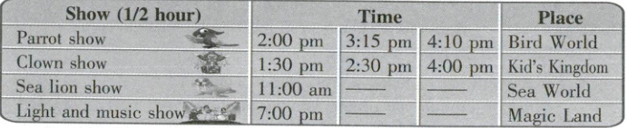 66. The first parrot show starts at ( 1:30 / 2:00) pm.