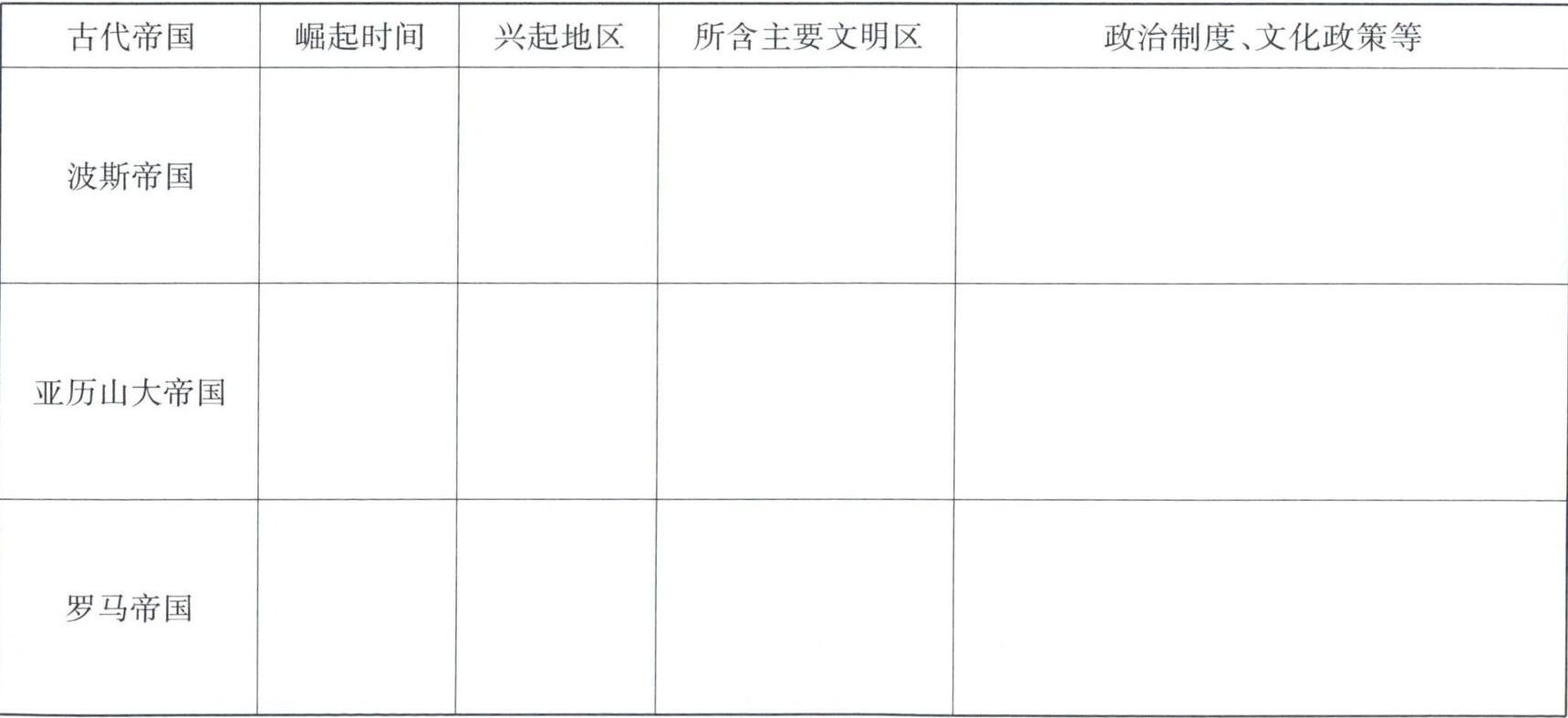 1. 结合课文和下列示意图,梳理波斯帝国、亚历山大帝国、罗马帝国的基本史实,完成下表。