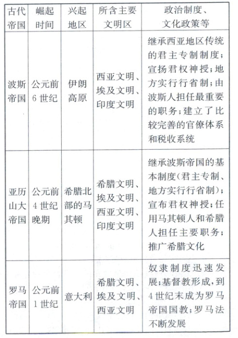 2.波斯帝国的区域性影响:继承和保护了古代西亚等地的文明,促进了埃及、印度、西亚等文明的交融。亚历山大帝国的区域性影响:推动了希腊文化在西亚、北非的传播,推动了“希腊化时代”的到来;促进了东西方文化的交流与传播。罗马帝国的区域性影响:以地中海为中心,整合了地中海周边的古代文明;促进了东西方文化的交融,扩大了文明联系的范围。