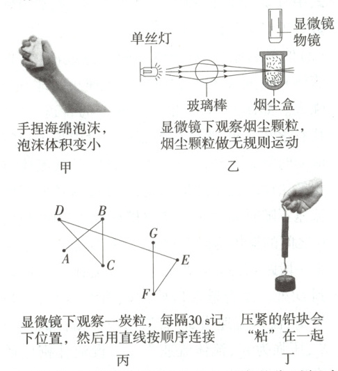 1.D 甲图中海绵泡沫体积变小,说明海绵泡沫物质间存在空隙,不能说明分子间有空隙,故 A 错误;乙图中烟尘颗粒做无规则运动,说明烟尘颗粒周围的空气分子在做无规则运动,故 B 错误;丙图中 AB 线段表示炭粒在 30 s 内的初、末位置的连线,不能表示其轨迹,故 C 错误;丁图中压紧的铅块会“粘”在一起,说明分子间存在引力,故 D 正确。