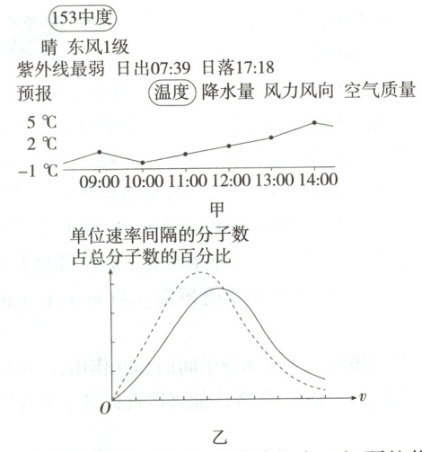 4. 创新题 | 新情境 (2025 湖北襄阳期中)某地某天的气温变化趋势如图甲所示,细颗粒物($ PM2.5$等)的污染程度为中度,出现了大范围的雾霾。在$11:00$和$14:00$的空气分子速率分布曲线如图乙所示,横坐标$v$表示分子速率,纵坐标表示单位速率间隔的分子数占总分子数的百分比。下列说法不正确的是 (