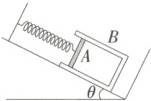 $11.$如图所示,在倾角为$\theta=30°$的斜面上放置一个带有活塞$A$的导热汽缸$B$,活塞用平行于斜面的轻弹簧拉住,弹簧的另一端被固定,弹簧的劲度系数为$k=300\ N/m$,初始状态活塞到汽缸底部内侧的距离为$L_1=27\ cm$,汽缸底部外侧到斜面底端挡板的距离为$L_2=1\ cm$,汽缸内气体的初始温度为$T_1=270\ K$。已知汽缸质量为$M=0.4\ kg$,活塞的质量为$m=0.2\ kg$,汽缸内部的横截面积为$S=1\ cm^2$,活塞与汽缸间密封一定质量的理想气体,该密封气体的内能$U$与温度$T$之间存在关系$U=k'T$,$k'=2×10^{-3}\ J/K$,不计一切摩擦,大气压为$p_0=1.0×10^5\ Pa$。现对汽缸进行缓慢加热,则 (