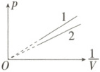 $(3)$某实验小组进行了两次正确的操作,并由记录的数据作出了$p-\frac{1}{V}$图像,如图中$1$、$2$线所示。若两次实验气体的质量一定,则气体温度$T_1$