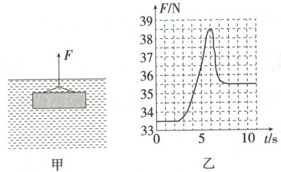 11.D 完全拉出水面时,轻绳的拉力等于钢板的重力,之后拉力不再发生变化,可知钢板重力$G = 35.5 N$,钢板在水面以下时的浮力$F_{ 浮} = G - F_{ 拉} = 35.5 N - 33.5 N = 2 N$,故A错误;由图乙知,在吊起钢板的过程中,钢板所受的拉力不是始终大于钢板的重力,故B错误;图乙中拉力$F$最大能到$38.5 N$的原因是水分子与钢板分子之间存在引力,故C错误,D正确。