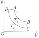 2.(2025重庆期中)如图是一定质量的气体的$p-V$图像,气体状态从$A→B→C→D→A$完成一次循环,$A→B$(图中实线)和$C→D$为等温过程,温度分别为$T_1$、$T_2$。下列判断正确的是(