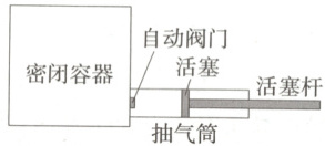 3.(2025湖北黄冈期中)活塞式真空泵的工作原理如图所示,抽气筒与密闭容器通过自动阀门相连,当活塞从抽气筒的左端向右移动到右端的过程中,阀门自动开启,密闭容器内的气体流入抽气筒,待稳定后,活塞从右端向左移动到左端的过程中,阀门自动关闭,抽气筒内活塞左侧的气体被排出,即完成一次抽气过程,如此往复,密闭容器内的气体压强越来越小。若密闭容器的容积为$V$,抽气筒的容积为$\frac{1}{20}V$,抽气过程中气体的温度不变,第1次抽气过程中被抽出的气体质量为$m_1$,第4次抽气过程中被抽出的气体质量为$m_4$,则$m_1$与$m_4$之比是