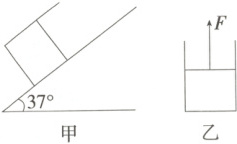 4.(2025河南开封期末)质量分别为$M$和$m$的汽缸与活塞密闭性和导热性良好,活塞可在汽缸内无摩擦上下移动,汽缸内封闭一定质量的气体,现将汽缸从倾角为$37°$的斜面由静止释放,如图甲,汽缸与斜面之间的动摩擦因数为$\mu=0.25$,重力加速度为$g$,斜面足够长,待汽缸稳定向下运动时,汽缸内封闭的气体体积为$V$。然后将汽缸置于水平地面上,如图乙,用竖直向上的力缓慢向上拉活塞至汽缸刚要离开地面。活塞的横截面积为$S$,外界大气压强为$p_0$,周围环境温度保持不变,$\sin37°=0.6$,$\cos37°=0.8$。求: