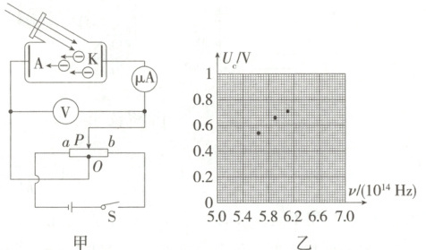 区间(选填“$Oa$”或“$Ob$”)。经多次实验,测得如下数据:在图乙中绘制 $U_c - ν$关系图像,请描绘剩余的两个点并作出最佳拟合直线,计算得图像的斜率 $k =$
