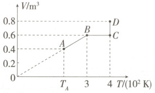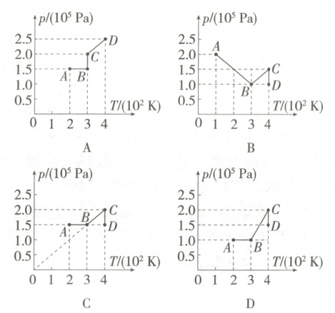 6.C 从题图可以看出,A与B连线的延长线经过原点,可知从A到B发生等压变化,即有$p_A = p_B$,根据盖−吕萨克定律有$\frac{V_A}{T_A}=\frac{V_B}{T_B}$,解得$T_A = 200K$;从B到C发生等容变化,根据查理定律有$\frac{p_B}{T_B}=\frac{p_C}{T_C}$,解得$p_C = 2.0×10^5Pa$;从C到D发生等温变化,根据玻意耳定律有$p_CV_C = p_DV_D$,解得$p_D = 1.5×10^5Pa$,结合上述,只有C选项中的图像满足要求。故选C。