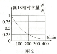 (2)由图2可知,氟18的半衰期$\tau = 100 min$