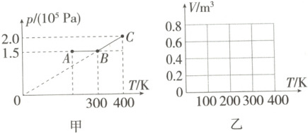 (2)在图乙坐标系中,作出由状态$A$经过状态$B$变为状态$C$的$V-T$图像,并在图线相应位置上标出字母$A$、$B$、$C$。如果需要计算才能确定坐标值,请写出计算过程。