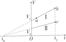 如图,一定质量的理想气体经历的两个不同过程,分别由体积—温度($V-t$)图上的两条直线Ⅰ和Ⅱ表示,$V_1$和$V_2$分别为两直线与纵轴交点的纵坐标,$t_0$为它们的延长线与横轴交点的横坐标,$t_0 = -273.15 ° C $;$a$、$b$为直线Ⅰ上的点。由图可知,气体在状态$a$和状态$b$的压强之比$k_1$和气体在状态$b$和状态$c$的压强之比$k_2$为 (