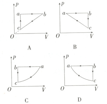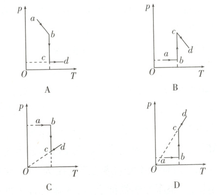 4.D $a \to b$过程,气体压强不变,温度升高,由$\frac{V}{T}=C$可知气体体积增大;$b \to c$过程,$p-T$图线为延长线过坐标原点的倾斜直线,根据理想气体状态方程,可知气体体积不变;$c \to a$过程,气体温度不变,根据$pV = C$可知$p-V$图线为双曲线的一支,故选D。