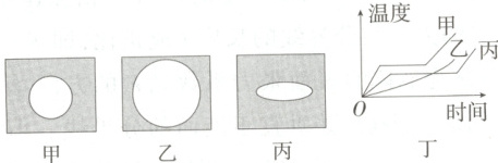 2.(2025 重庆沙坪坝期中)在甲、乙、丙三块固体薄片上涂上蜡,用烧热的针尖接触其背面一点,蜡熔化的范围分别如图甲、乙、丙所示。而三块固体在熔化过程中温度随加热时间变化的关系如图丁所示,则下列说法中正确的是 (