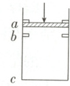 在卡销$a$、$b$之间,$b$与汽缸底部的距离$b\overline{c}=10\ \overline{ab}$,活塞的面积为$1.0×10^{-2}\ m^2$。初始时,活塞在卡销$a$处,汽缸内气体的压强、温度与活塞外大气的压强、温度相同,分别为$1.0×10^5\ Pa$和$300\ K$。在活塞上施加竖直向下的外力,逐渐增大外力使活塞缓慢到达卡销$b$处(过程中气体温度视为不变),外力增加到$200\ N$并保持不变。
