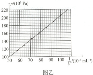 (2)若气体被压缩到 V = 10.0 mL,则有$\frac {1}{V}$=$\frac {1}{10.0}$mL⁻¹ = 100×10⁻³ mL⁻¹,由图乙可读出封闭气体压强为 p = 2.04×10⁵ Pa。