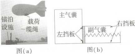 “系留气球”是一种用缆绳固定于地面、高度可控的氦气球,作为一种长期留空平台,具有广泛用途。图(b)为某一“系留气球”的简化模型图:主、副气囊通过无漏气、无摩擦的活塞分隔,主气囊内封闭有一定质量的氦气(可视为理想气体),副气囊与大气连通。轻弹簧右端固定、左端与活塞连接。当气球在地面附近达到平衡时,活塞与左挡板刚好接触(无挤压),弹簧处于原长状态。在气球升空过程中,大气压强逐渐减小,弹簧被缓慢压缩。当气球上升至目标高度时,活塞与右挡板刚好接触(无挤压),氦气体积变为地面附近时的$1.5$倍,此时活塞两侧气体压强差为地面附近大气压强的$\frac { 1 } { 6 }$。已知地面附近大气压强$p _ { 0 } = 1 . 0 × 1 0 ^ { 5 } \mathrm { P a }$、温度$T _ { 0 } = 3 0 0 \mathrm { K }$,弹簧始终处于弹性限度内,活塞厚度忽略不计。