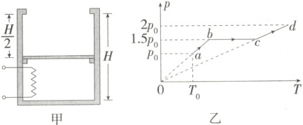6.(2025湖北黄冈期中)如图甲所示,一高度为$H$的汽缸竖直放置,汽缸壁和活塞都是绝热的,活塞横截面积为$S$,在汽缸的正中间和缸口处有固定卡环,活塞可以在两个卡环之间无摩擦运动。活塞的厚度不计。活塞下方封闭有一定质量的理想气体,已知理想气体内能$U$与温度$T$的关系为$U=αT$,$α$为正的常量,重力加速度为$g$。开始时封闭气体温度为$T_0$,压强等于外界大气压强$p_0$,现通过电热丝缓慢加热,封闭气体先后经历了如图乙所示的三个状态变化过程,则(