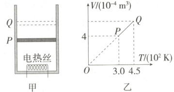9.(2025江西南昌期末)绝热的活塞与汽缸之间封闭一定质量的理想气体,汽缸开口向上置于水平面上,活塞与汽缸壁之间无摩擦,缸内气体的内能$U_P=72J$,如图甲所示。已知活塞面积$S=5×10^{-4}m^2$,其质量为$m=2kg$,大气压强$p_0=1.0×10^5Pa$,重力加速度$g=10m/s^2$。如果通过电热丝给封闭气体缓慢加热,活塞由原来的$P$位置移动到$Q$位置,此过程封闭气体的$V-T$图像如图乙所示,且知气体内能与热力学温度成正比。求: